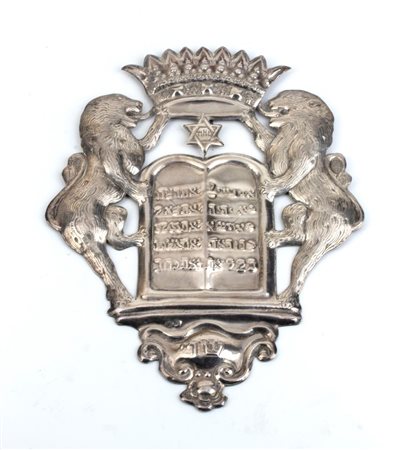 L'oggetto presenta una struttura centrale raffigurante le Tavole della Legge, con iscrizioni ebraiche che rappresentano i Dieci Comandamenti. Ai lati delle Tavole della Legge sono raffigurati due leoni rampanti, un motivo simbolico e ricorrente nell’arte ebraica, rappresentati iI coraggio e la forza, oltre a essere un riferimento alla tribù di Giuda, una delle dodici tribù di Israele. Sulla sommità è presente una corona, che sormonta una stella di Davide. Classificazione dello stato di conservazione: **** buono.