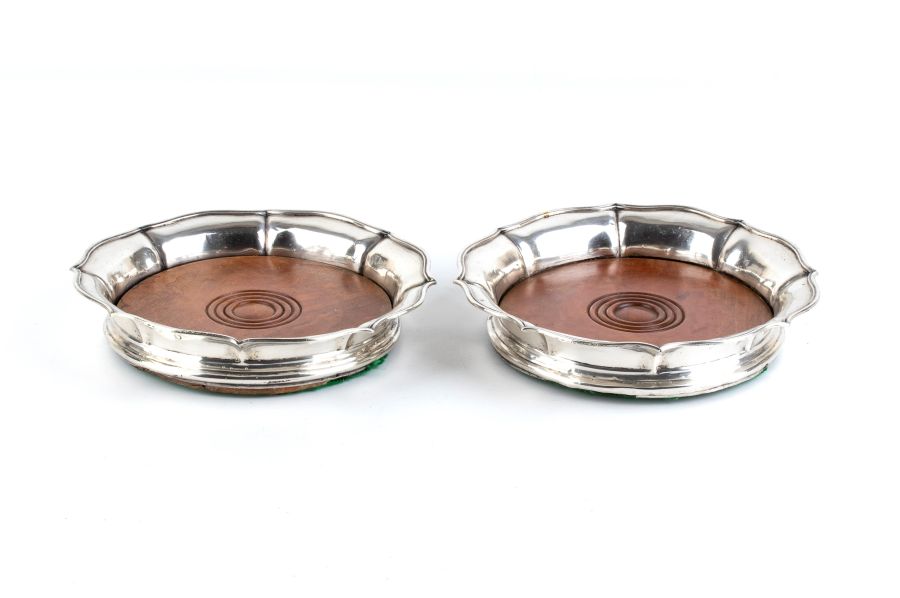 Coppia di sotto bottiglia olandesi in argento 1847 Altezza x larghezza x profondità: 2 x 15 x 15 cm. Peso complessivo lordo: 360 gr.