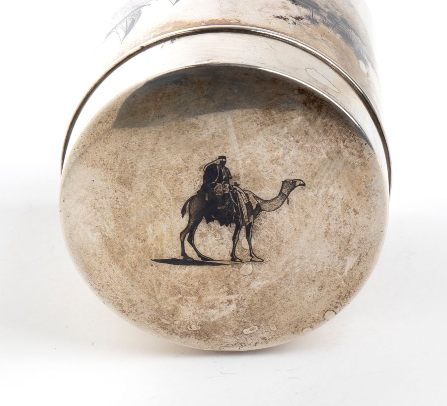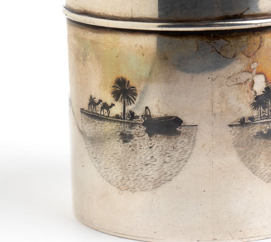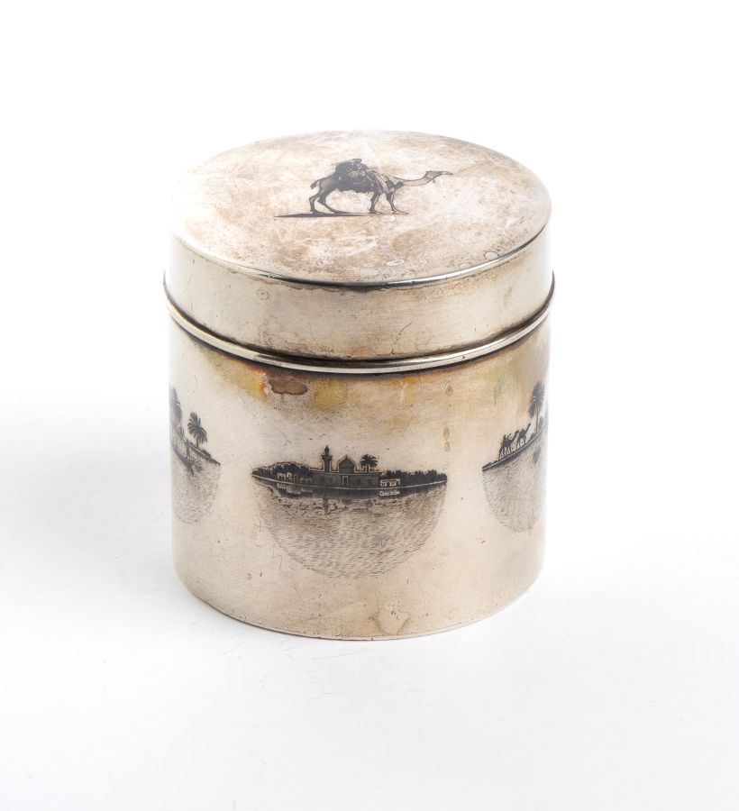 Scatola in argento e niello Inizio XX secolo Altezza x diametro: 7 x 6,7 cm. Peso: 200 gr.