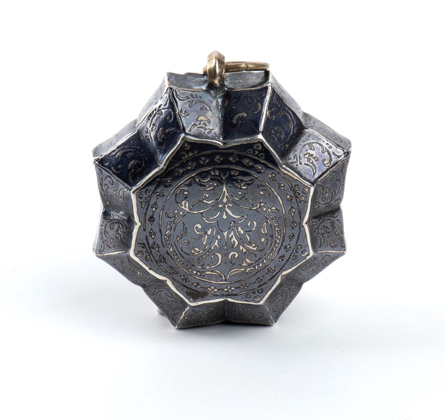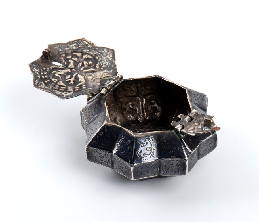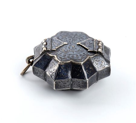 Altezza x larghezza x profondità: 3,3 x 5,8 x 5,8 cm. Peso: 94 gr. in argento niellato, di forma ottagonale con lati concavi decorata a motivi floreali. Classificazione dello stato di conservazione: **** buono.