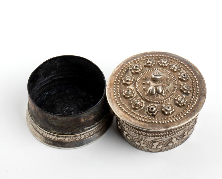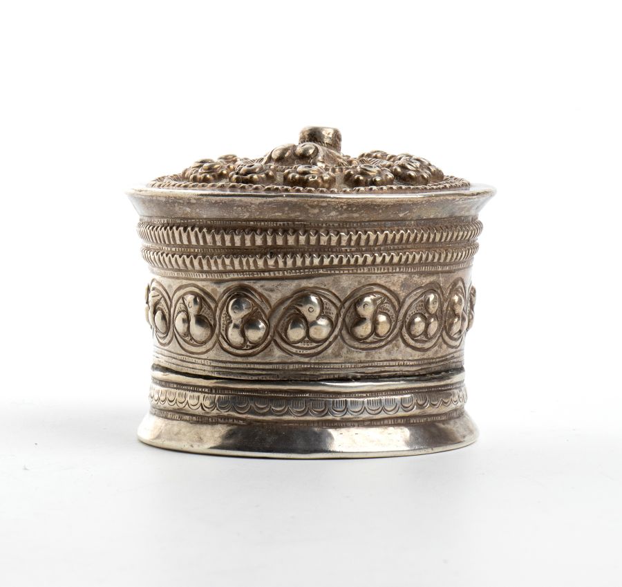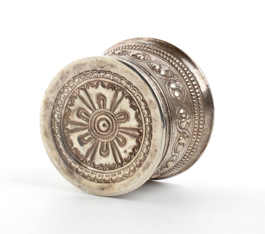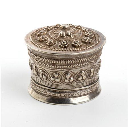 Scatola birmana in argento XIX secolo Altezza x diametro: 6,8 x 7,4. Peso: 148 gr.