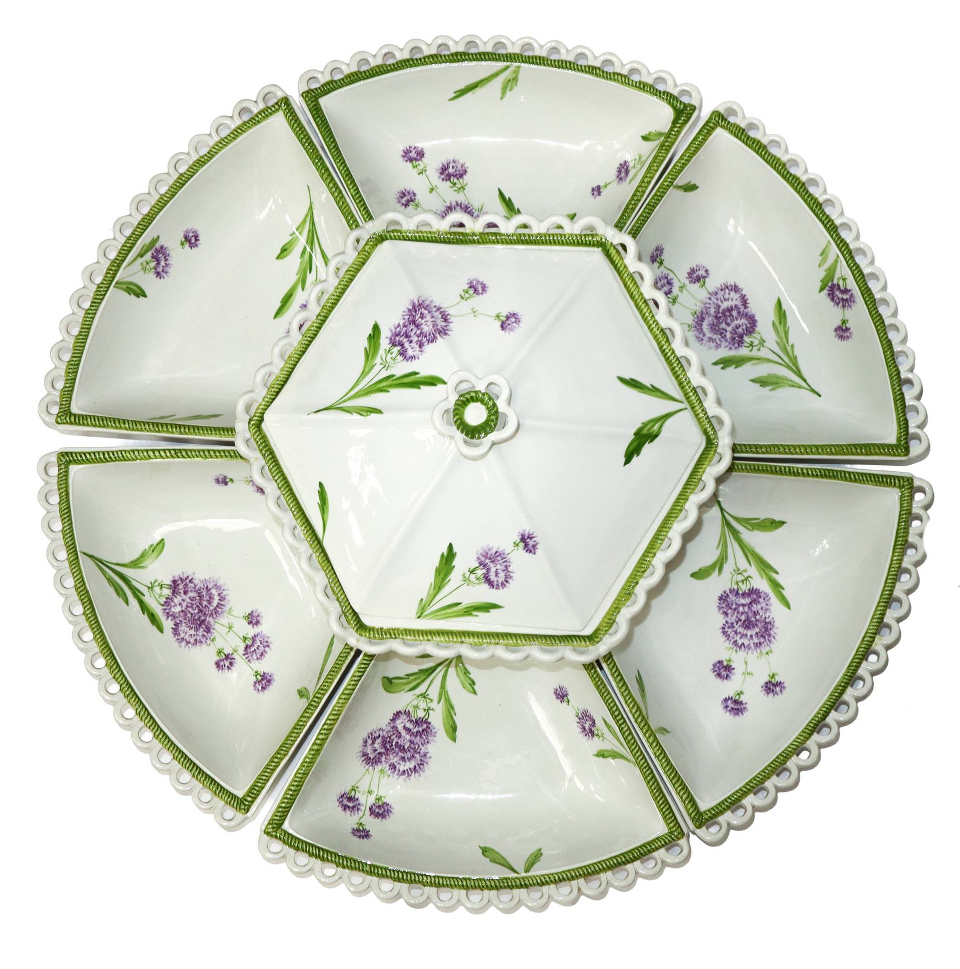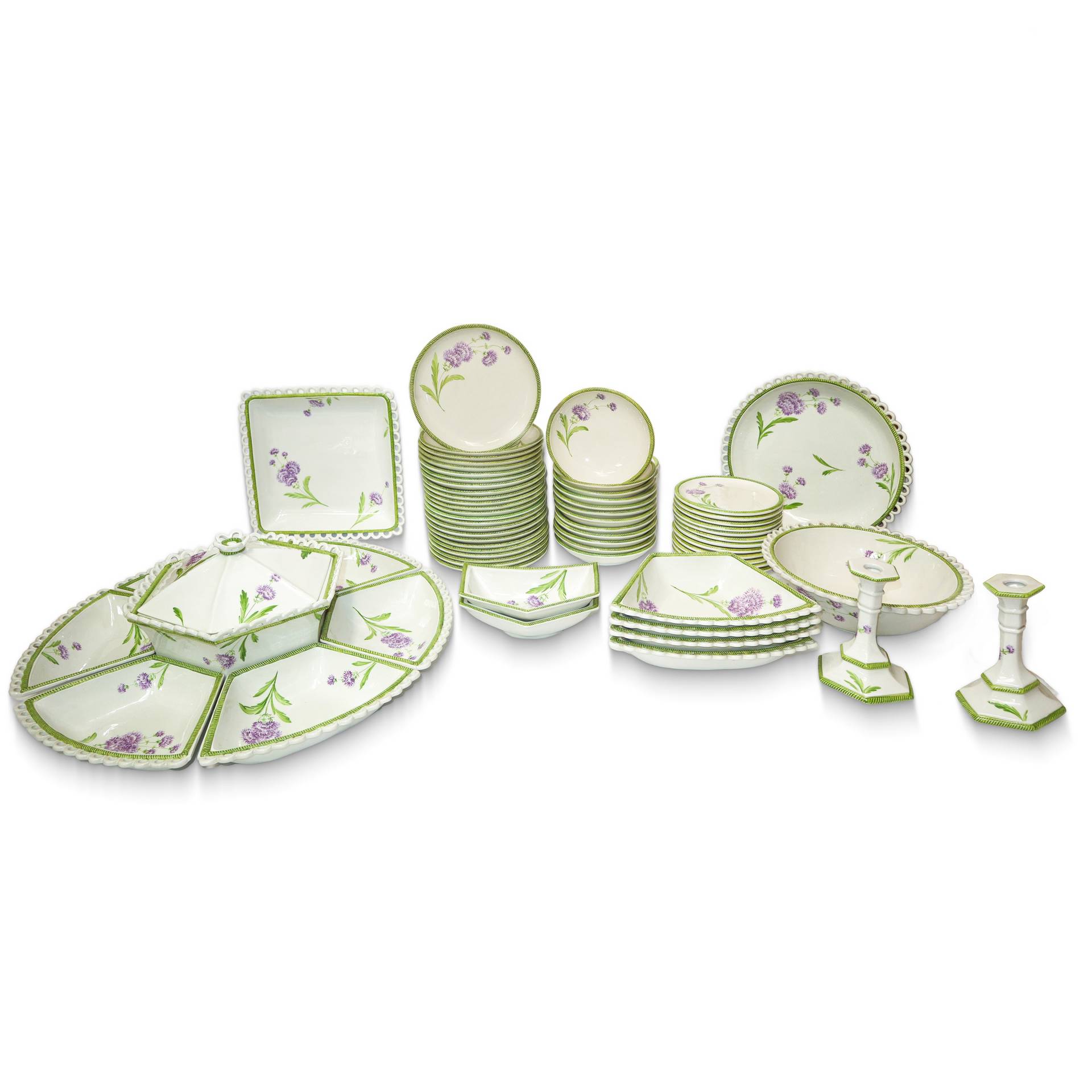 Servizio ''Valle'' da 12 con bordo a treccia verde e fiori di lavanda Servizio composto da: 24 piatti piani, 12 piatti fondi, 12 piatti frutta, 10 elemnti angolari smerlati, 2 elementi angolari, 1 zuppiera, 1 insalatiera, 1 piatto da portata rotondo, 2 candelieri Servizio composto da: 24 piatti piani, 12 piatti fondi, 12 piatti frutta, 10 elemnti angolari smerlati, 2 elementi angolari, 1 zuppiera, 1 insalatiera, 1 piatto da portata rotondo, 2 candelieri