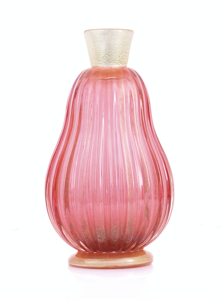 VASO IN VETRO ROSSO CON INCLUSIONI IN ORO, A.SEGUSO, ANNI '70, piriforme costolato.