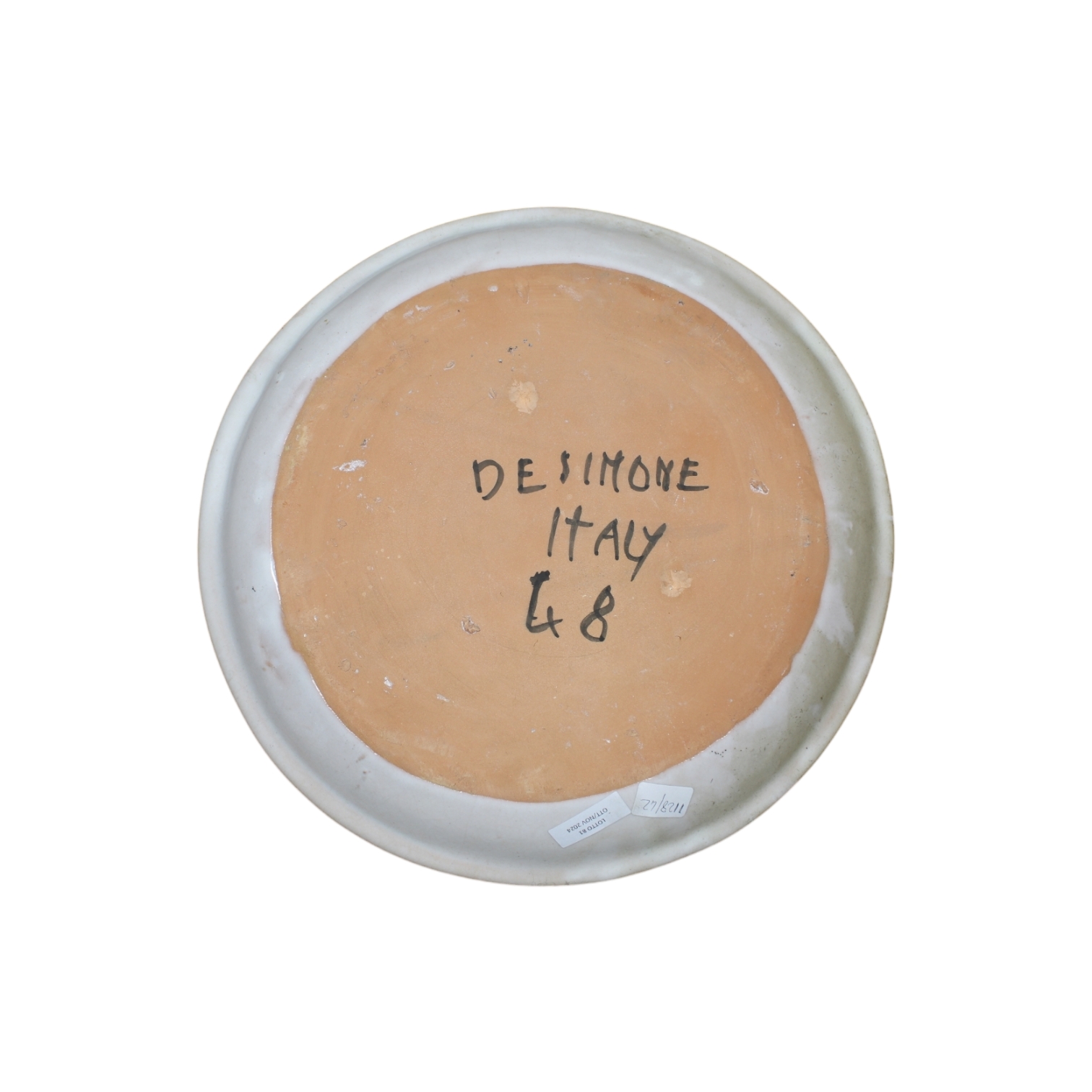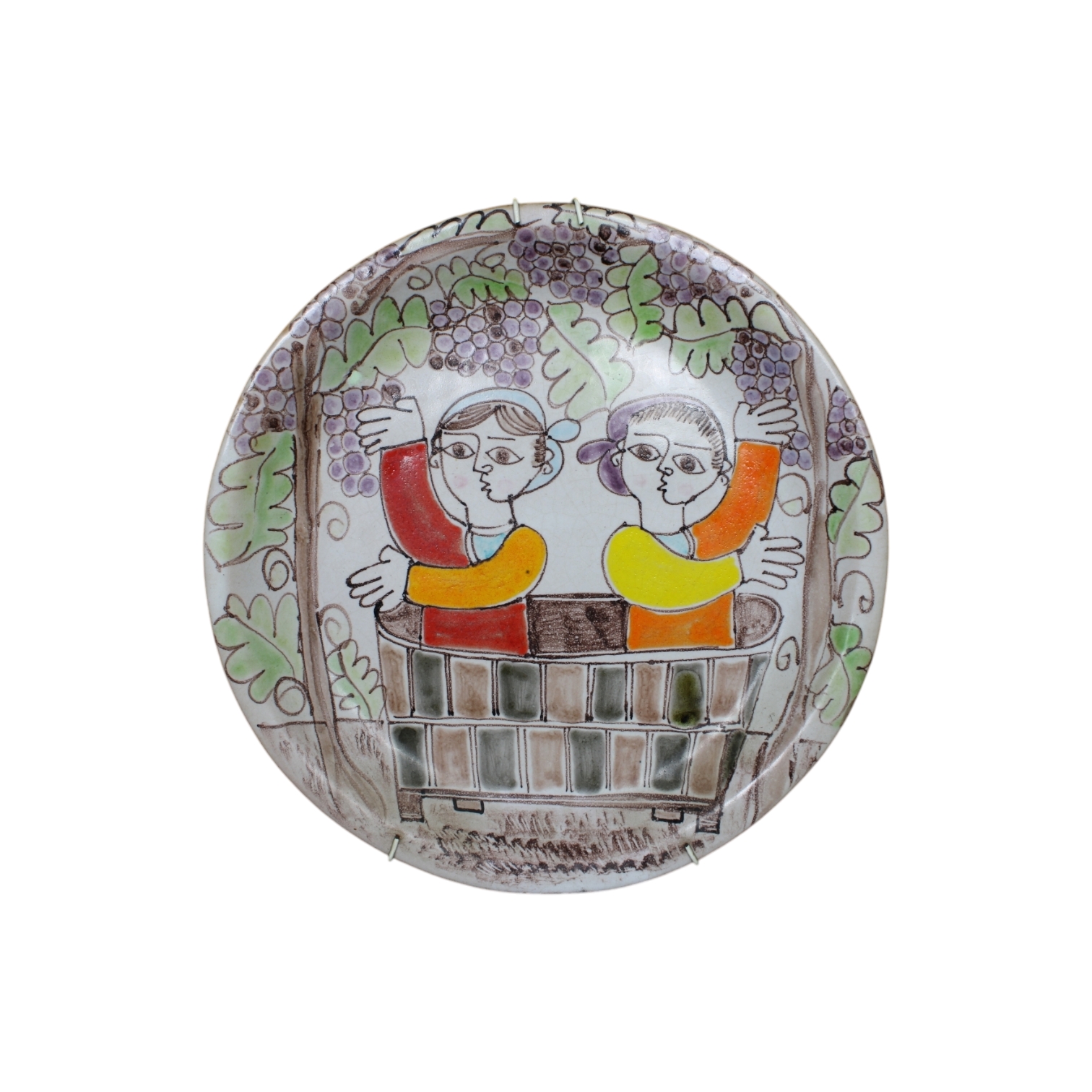 PIATTO in maiolica invetriata raffigurante la vendemmia manifattura De Simone Sicilia XX secolo cm Ø 38