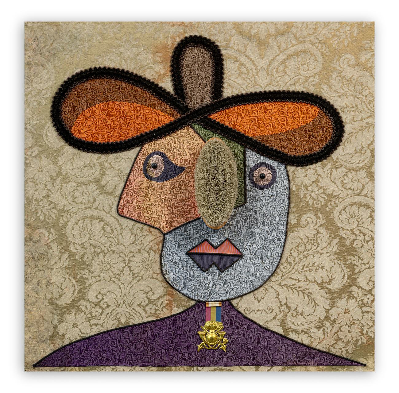 Ricamo in seta e collage su damasco supporto tavola