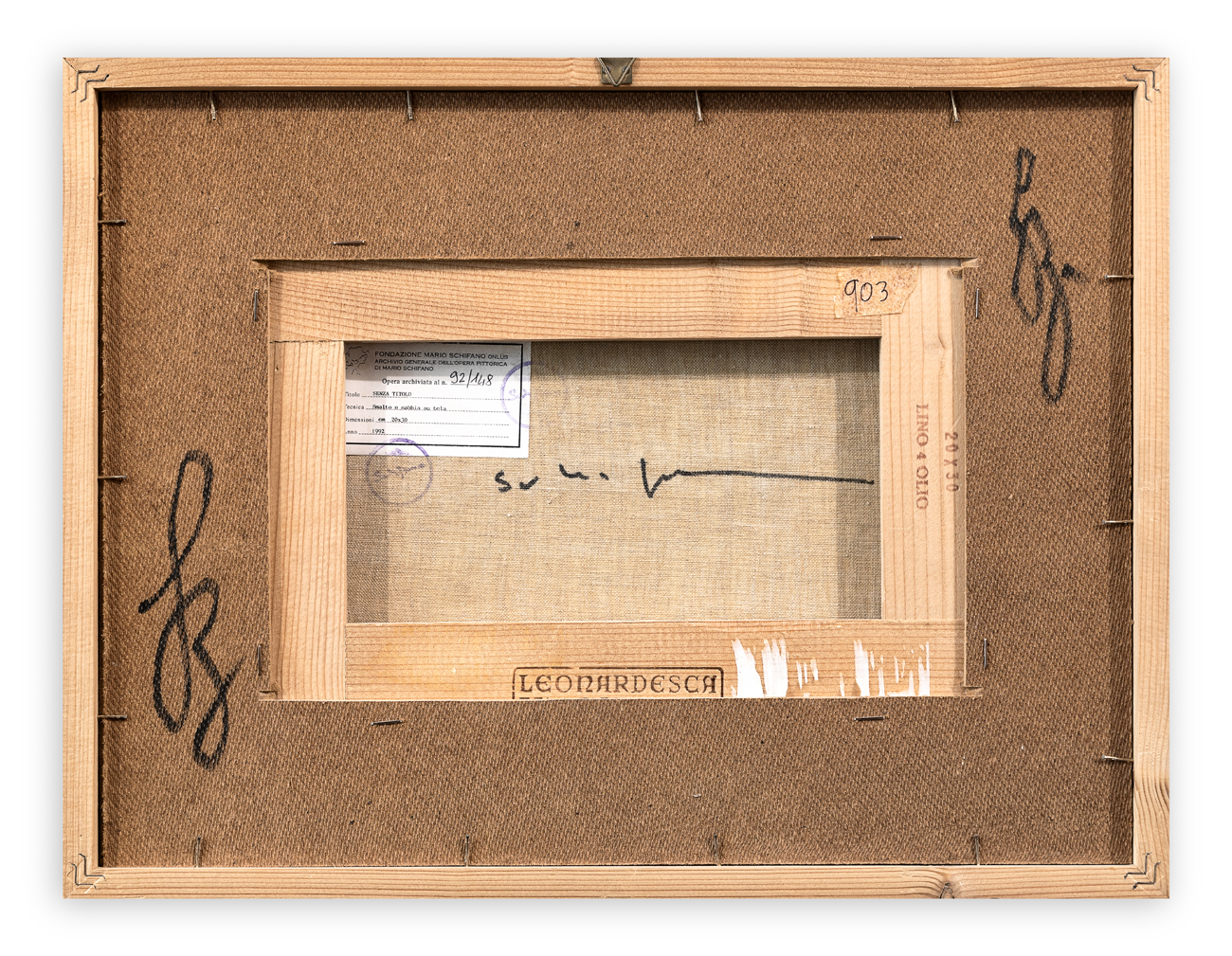 Etichetta e timbri dell'Archivio Generale dell'Opera Pittorica di Mario Schifano - Fondazione Mario Schifano al retro