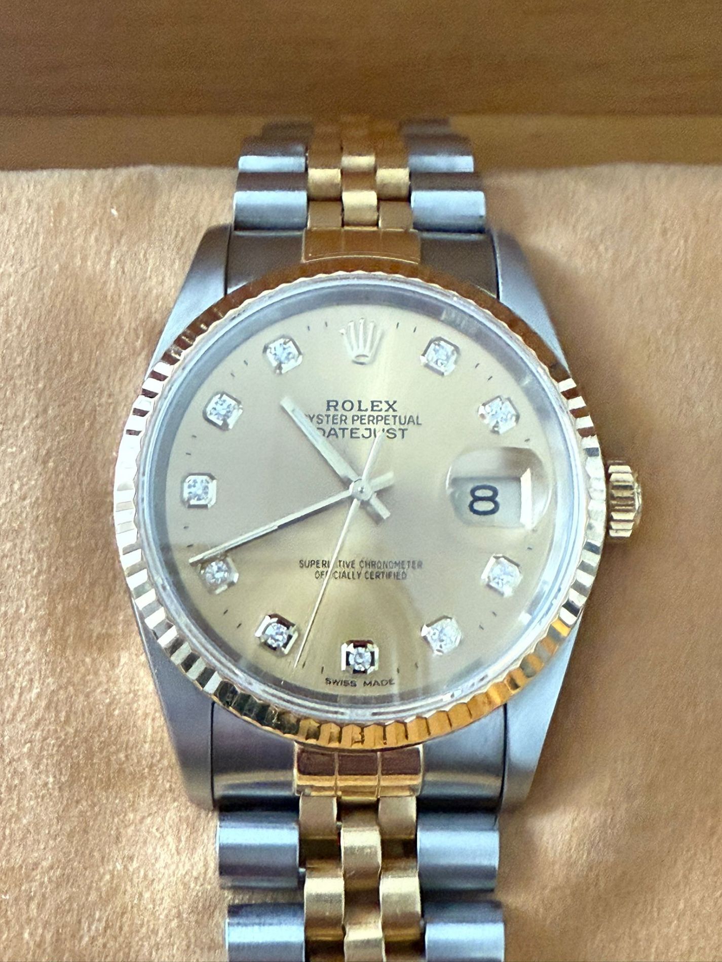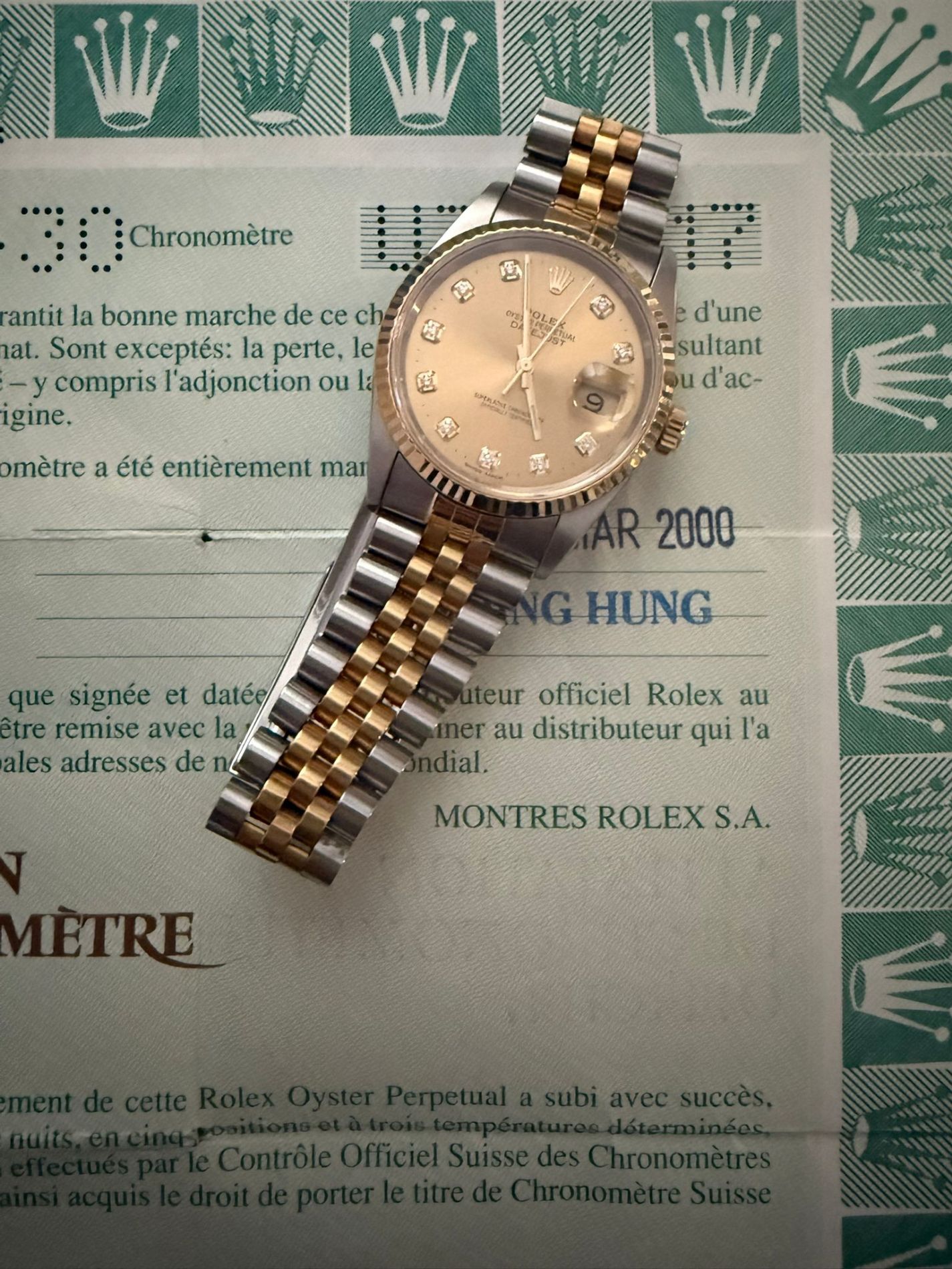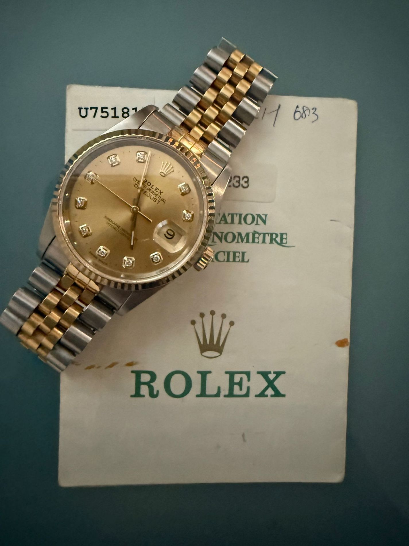 Marca Rolex Modello (Orologio) Datejust 36 Numero di referenza 16233 Carica Automatico Materiale della cassa Oro/Acciaio Materiale cinturino Oro/acciaio Anno 1997 Condizione Usato (Ottimo) L'articolo presenta segni di usura lievi, come ad esempio graffi leggeri, ma non percepibili al tatto. Corredo Con documenti originali, no box la scatola utilizzata solo per fotografie non in vendita Diametro 36 mm Impermeabile 10 ATM Materiale lunetta Oro giallo Vetro Vetro zaffiro Cinturino Materiale cinturino Oro/acciaio Colore cinturino Oro/acciaio Chiusura Déployante Materiale chiusura Acciaio Funzioni Data