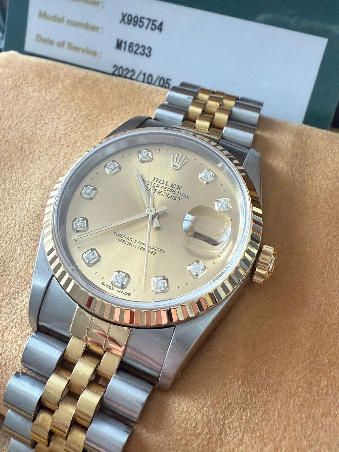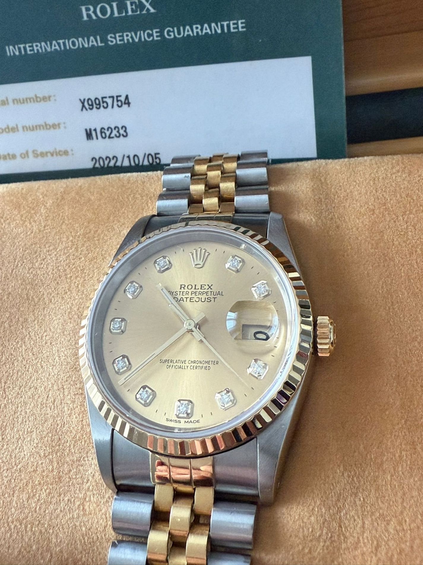 Marca Rolex Modello (Orologio) Datejust 36 Numero di referenza 16233 Carica Automatico Materiale della cassa Oro/Acciaio Materiale cinturino Oro/acciaio Anno 1991 Condizione Usato (Ottimo) L'articolo presenta segni di usura lievi, come ad esempio graffi leggeri, ma non percepibili al tatto. Corredo Senza documenti originali, no box la scatola utilizzata solo per fotografie non in vendita Service Rolex nel 2022 Diametro 36 mm Impermeabile 10 ATM Materiale lunetta Oro giallo Vetro Vetro zaffiro Cinturino Materiale cinturino Oro/acciaio Colore cinturino Oro/acciaio Chiusura Déployante Materiale chiusura Acciaio Funzioni Data