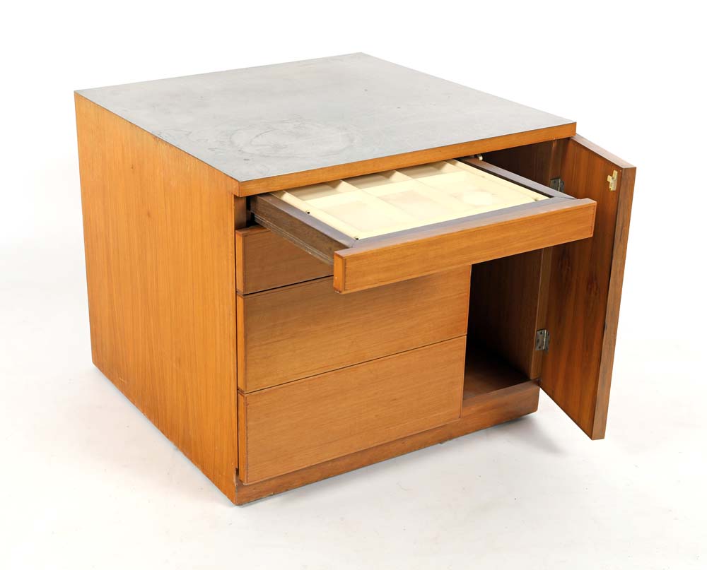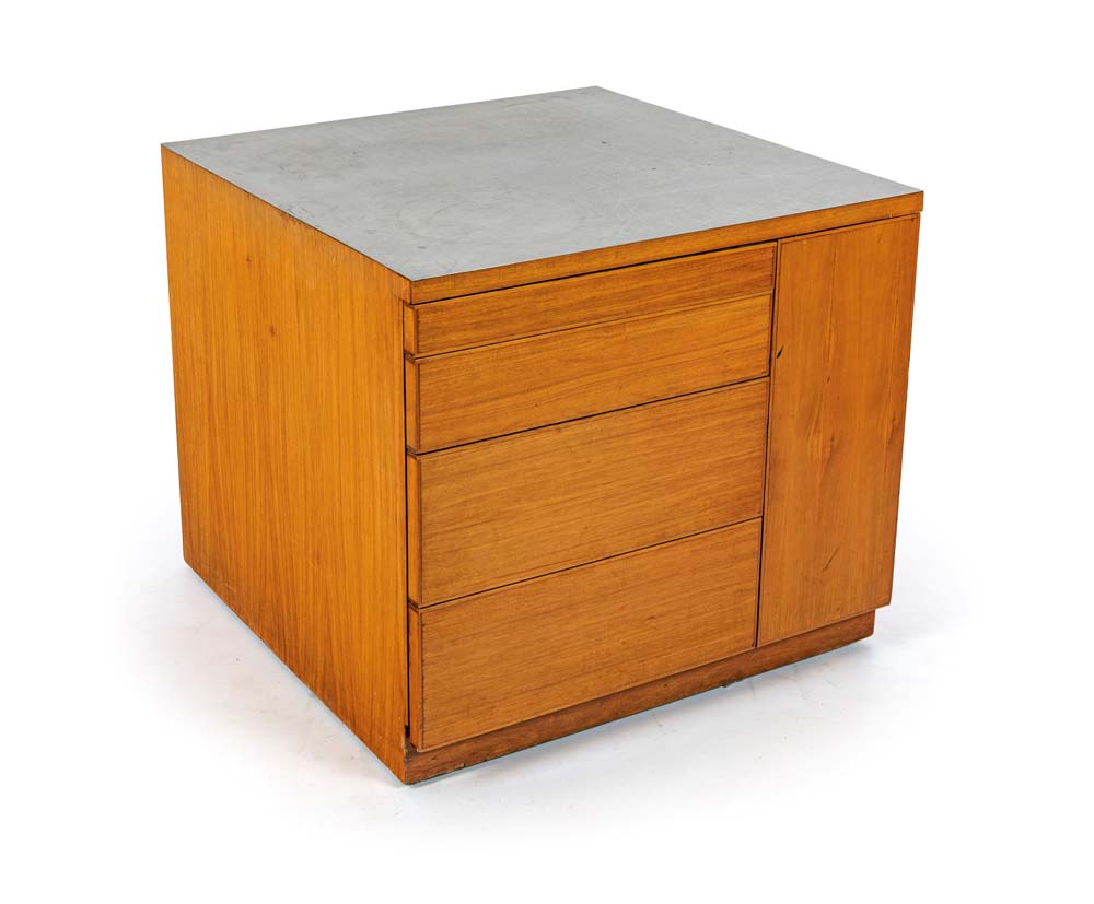 Cassettiera da ufficio produzione Italiana Anni '70 Struttura in legno e piano rivestito da una lamina di metallo cm 58x66x66 Composta da 4 cassetti ed un vano laterale a destra.