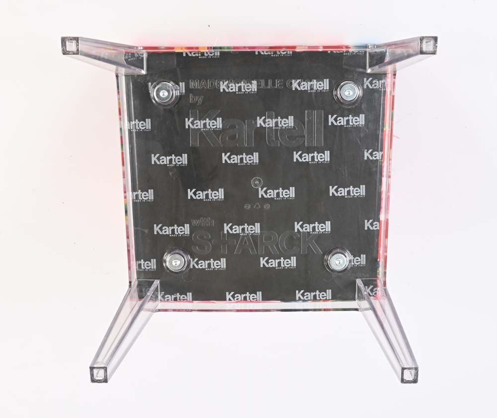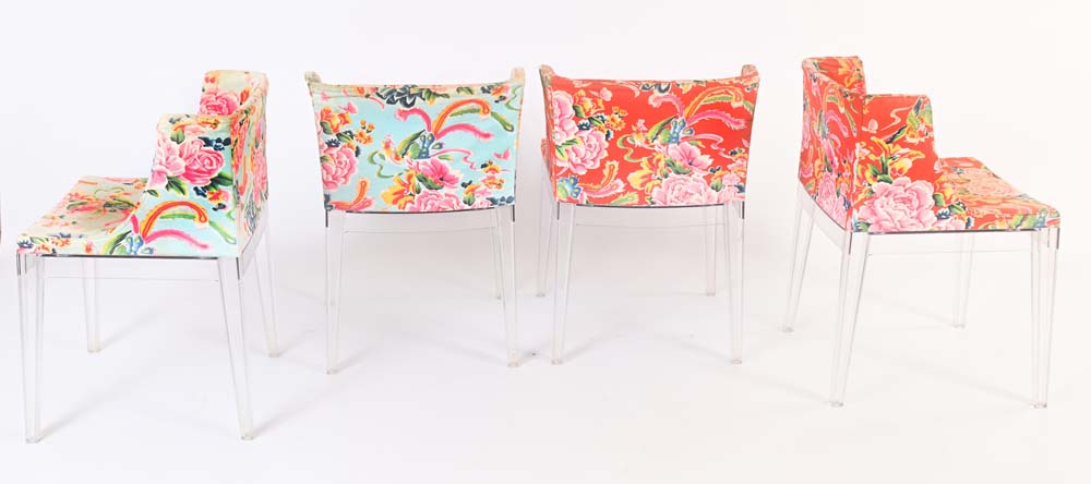 Philippe Starck Parigi 1949 Set di 4 sedie Mademoiselle produzione Kartell Anni '80 Struttura in policarbonato e rivestimento in tessuto cm h 73x50x50 l'una Sotto la seduta marchio del produttore "Mademoiselle Chair Kartell Stack".