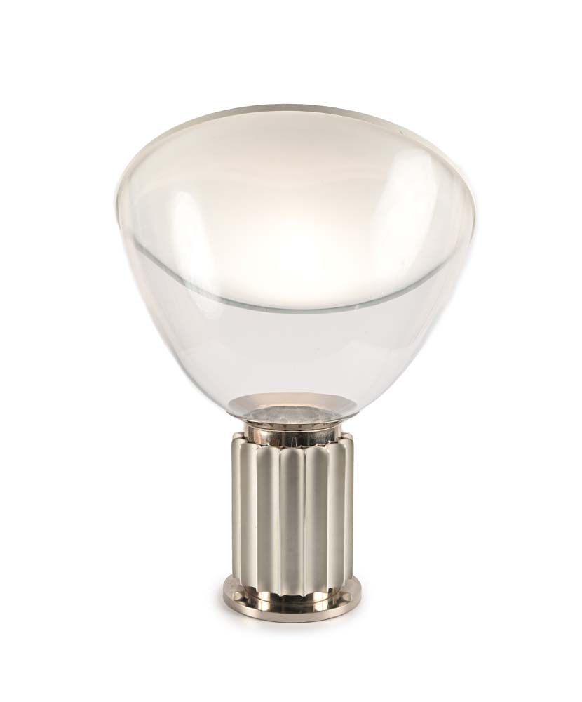 Achille e Pier Giacomo Castiglioni Lampada da tavolo modello Taccia a luce riflessa 1962 cm cm h 65x49 (diametro) Struttura in alluminio estruso laccato e base in metallocromato. Diffusore orientabile in vetro soffiato e riflettore in metallo laccato.