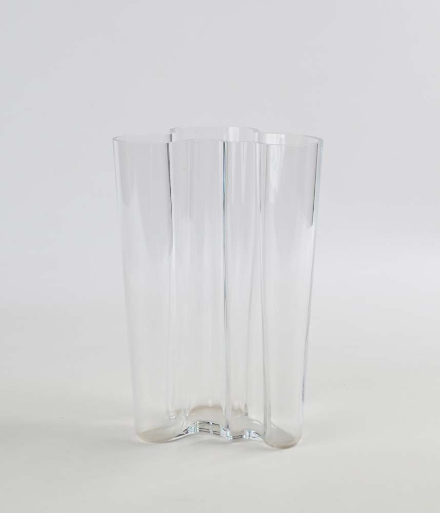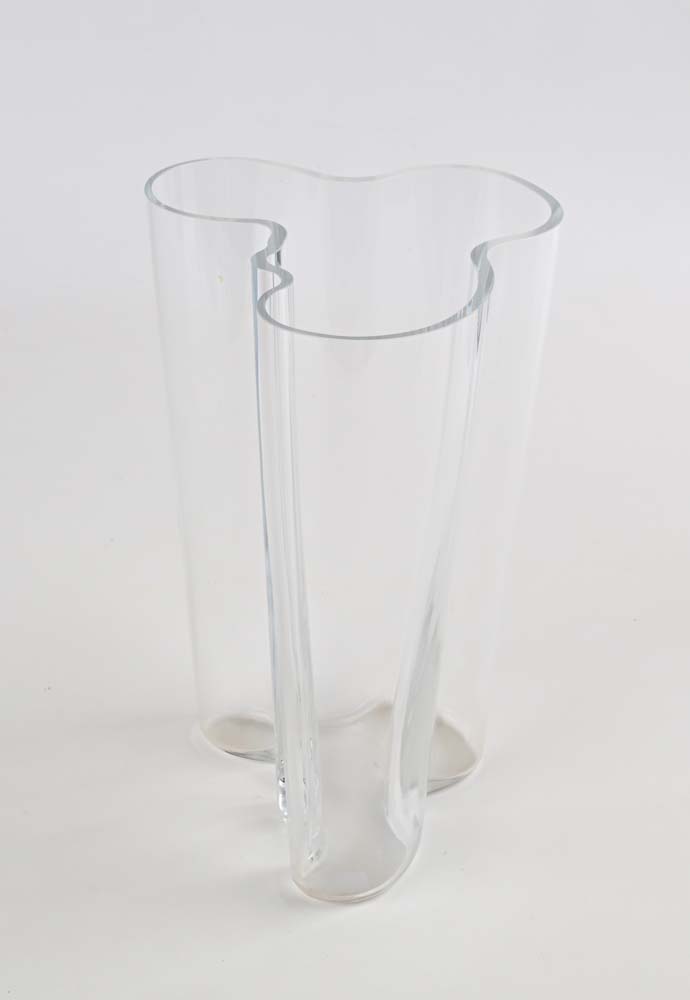 Alvar Aalto Kuortane 1898-Helsinki 1976 Vaso in vetro incolore soffiato di forma polilobata, prod. Littala altezza cm 25 x 16x16 Sotto la base marchio "Littala"