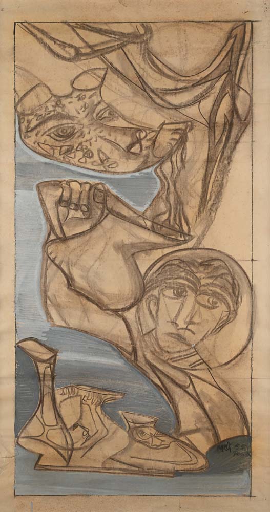 Salvatore Meli Comiso 1929-Roma 2011 Senza titolo Carboncino e tempera su carta cm 108x60 - in cornice cm 115x67 Firma e data "Meli '55 Roma".