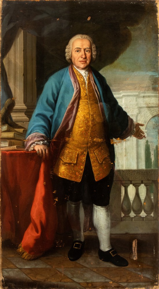 Il dipinto reca iscrizione, con data di esecuzione e identità del ritrattato, sul bordo della balaustra in basso a destra: "MDCCLXVIII / CES. HORATs. BENALEUS / AETATIS. LXXII.".
