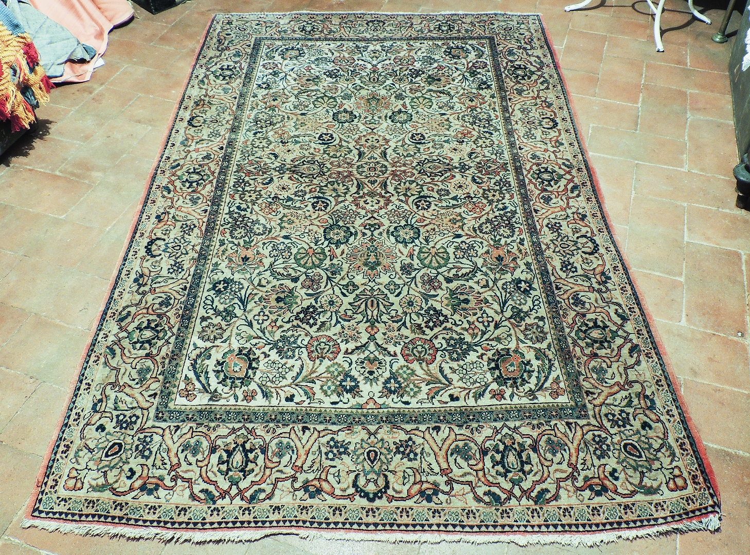 TAPPETO PERSIANO fondo beige, campo con motivi floreali nei toni del blu, verde e rosa, lievi difetti cm 199x132