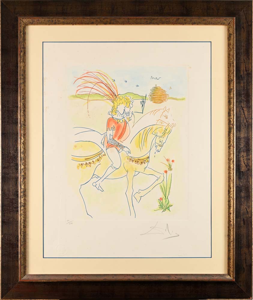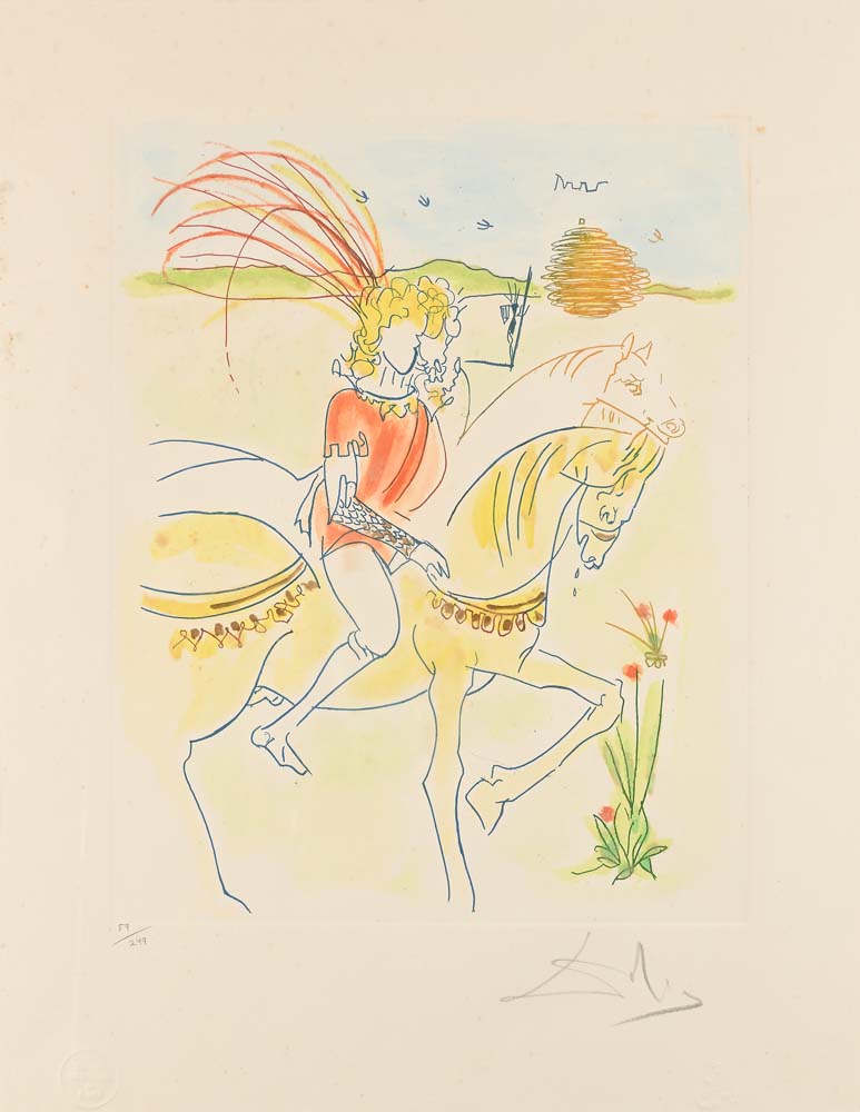 Salvador Dalì Figueres 1904-Figueres 1989 Viviane et Lancelot 1975 Incisione cm 76x56 - in cornice cm 95x81 Firma e numerazione "Dalì, 59/299". Timbri a secco dello stampatore e dello studio dalì. Certificato di autenticità e provenienza rilasciata dalla Grafica Lombardi