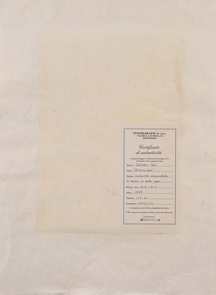 Salvador Dalì Figueres 1904-Figueres 1989 Metamorfosi 1969 Ceramolle cm 60x45,5 Firma e numerazione "Dalì XXXVI/LXX". Timbro a secco dello stampatore. Al verso reca etichetta della "Intergrafica, Roma".