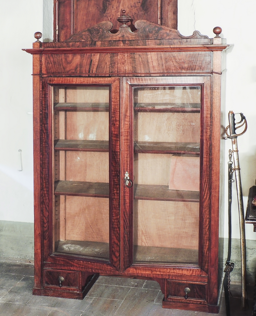 PARTE SUPERIORE DI VETRINA IN PIUMA E RADICA DI NOCE XIX secolo cimasa sagomata con pinnacoli, fronte dritto a due sportelli e due mezzi cassetti sottostanti, difetti h cm 150x98x34,5