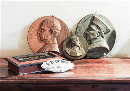 LOTTO un campanello da servitù d'epoca, due targhe da medico del Prof. Pandolfi e tre bassorilievi circolari con effigie di Filippo Strozzi, Giovanni e Cosimo de Medici, uno firmato e datato (5)