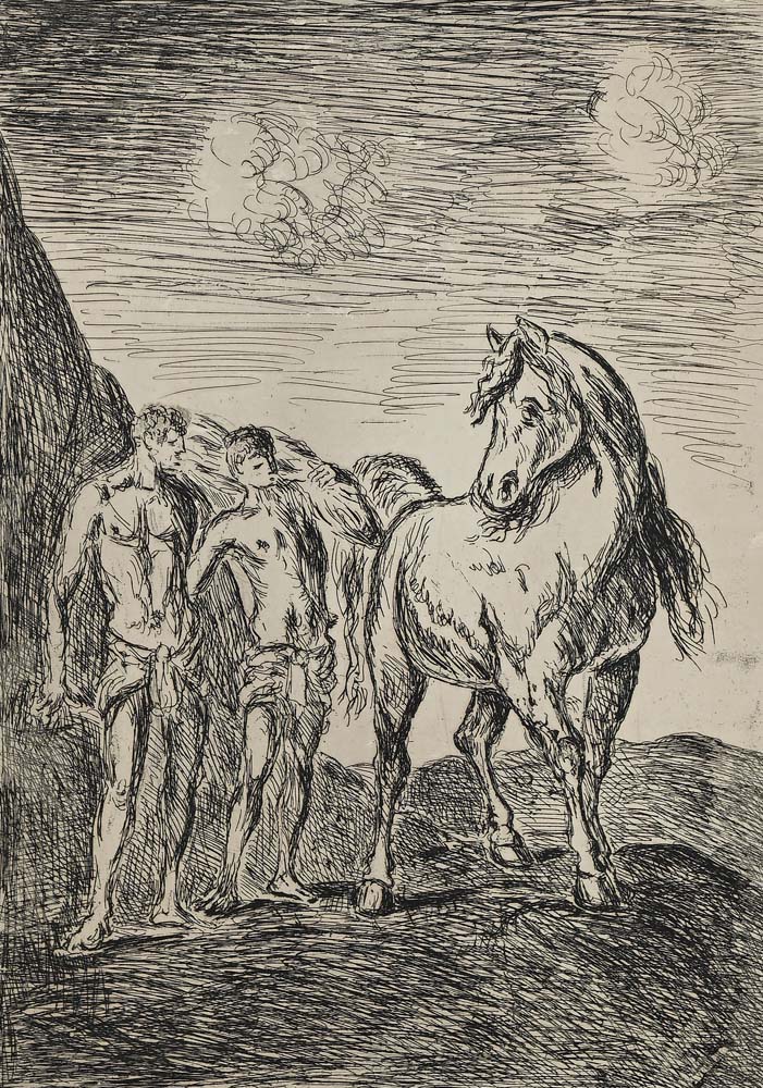 Giorgio De Chirico Volo 1888-Roma 1978 Due figure con cavallo Acquaforte cm 35x25 (lastra) - in cornice cm 83x63 Firma e numerazione "G. De Chirico 14/50". Timbro a secco in basso a destra