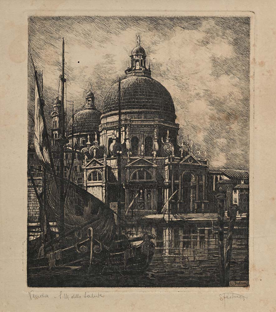 Ernesto Festucci Due incisioni raffiguranti Venezia (Dettaglio di San Marco e Santa Maria della Salute) Ognuna misura cm 32x26. Tutte e due le incisioni sono firmate e titolate a matita