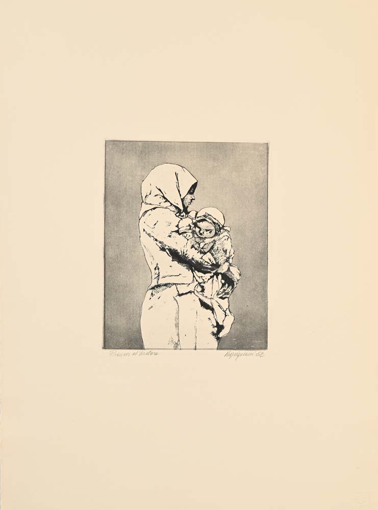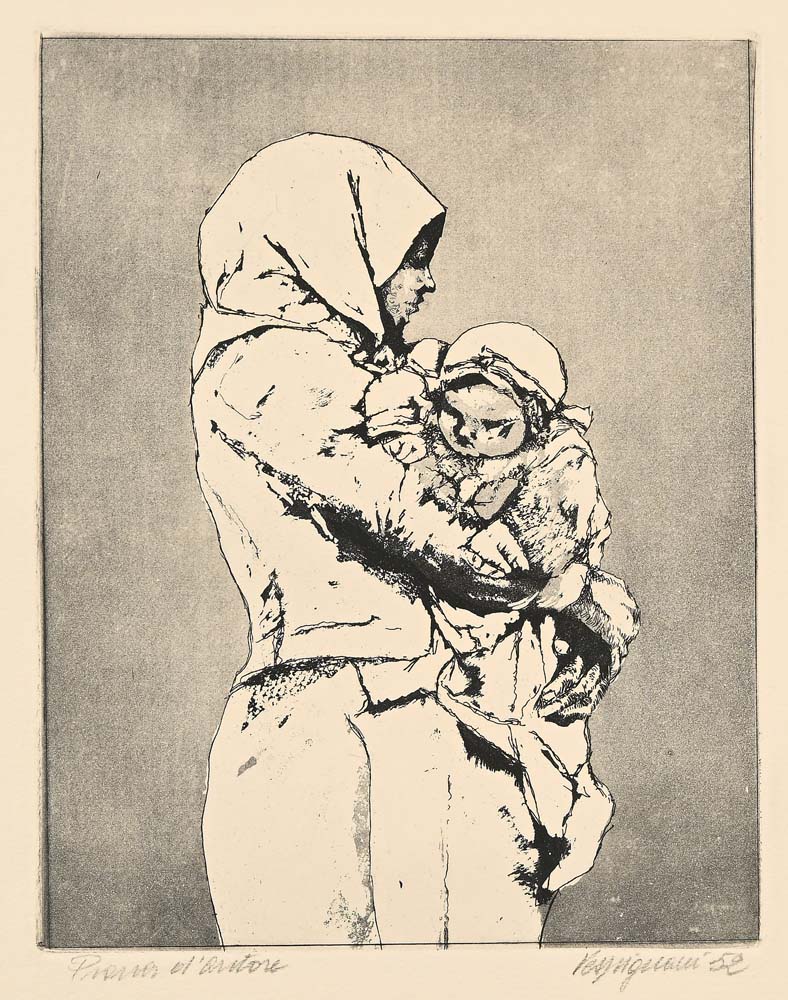 Renzo Vespignani Roma 1924-Roma 2001 Maternità 1952 Acquaforte cm 53x39 Firma, data e numerazione "Vespignani '52 Prova d'autore". Timbro a secco "Alberto Caprini stampatore in Roma".