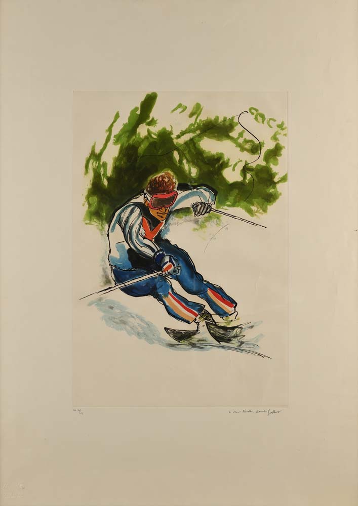 Renato Guttuso Bagheria 1911-Roma 1987 Sciatore Acquaforte/acquatinta cm 89x65 - in cornice cm 95x70 Firma, dedica e numerazione "H.C. 14/15, A Maria Novello, Guttuso". Timbri a secco dello stampatore