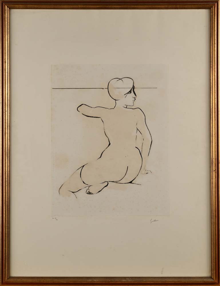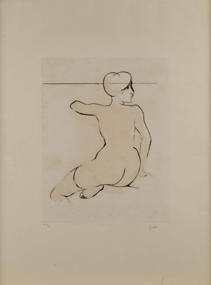 Renato Guttuso Bagheria 1911-Roma 1987 Nudo di donna sedua Acquatinta cm 80x60 - in cornice cm 84x64 Firma e numerazione "Guttuso, H.C. 17/25". Timbri a secco degli stampatori in basso a sinistra
