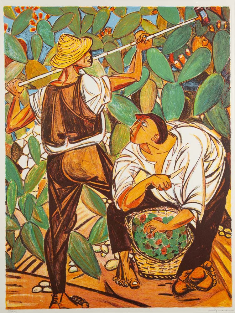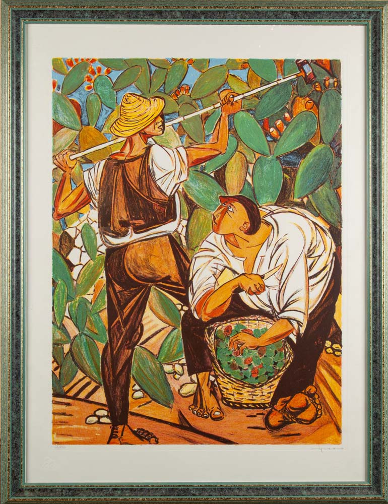 Giuseppe Migneco Messina 1903-Milano 1997 La raccolta dei fichi d'India Litografia cm 80x60 - in cornice cm 88x68 Firma e numerazione "Migneco 25/120". Timbri a secco