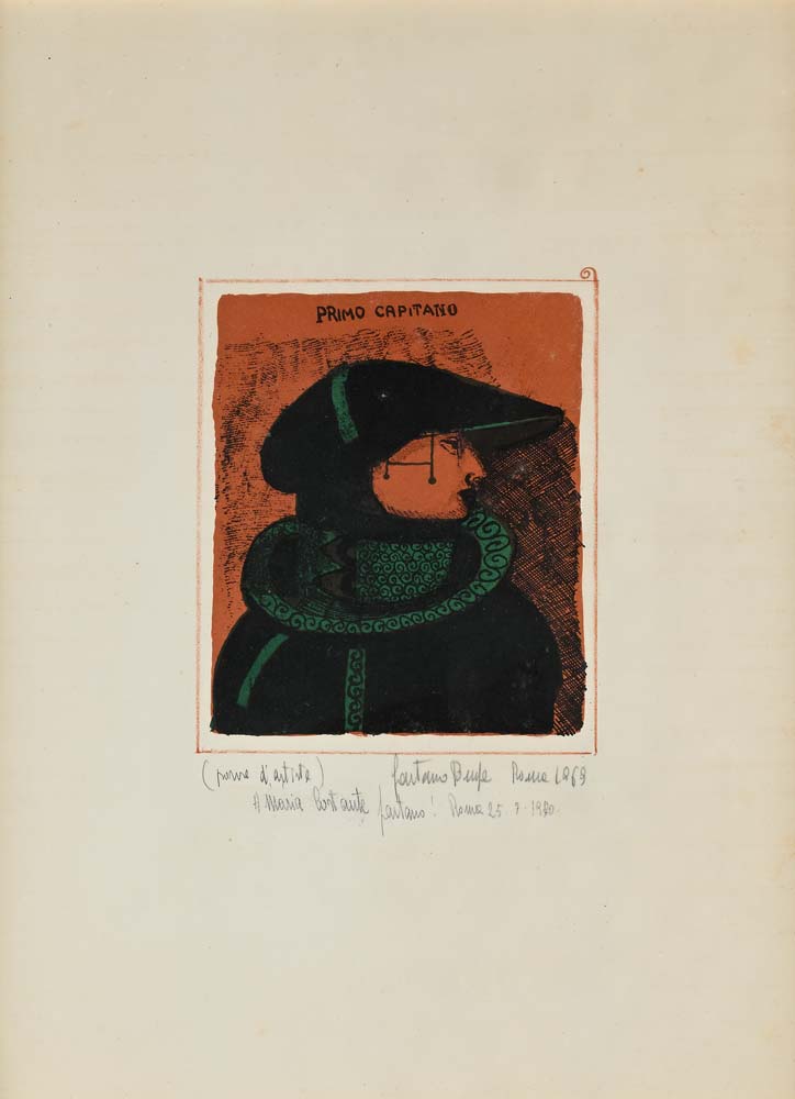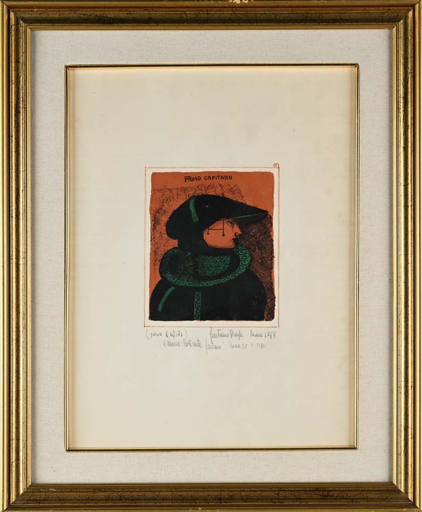 Gaetano Pompa Forenza 1933-Orbetello 1998 Primo Capitano 1969 Litografia cm 41x31 - in cornice cm 55x45 Firma, data, numerazione e dedica "Gaetano Pompa, Roma 1969, Prova d'Artista, A Maria Costante Gaetano, Roma 25.7.1970