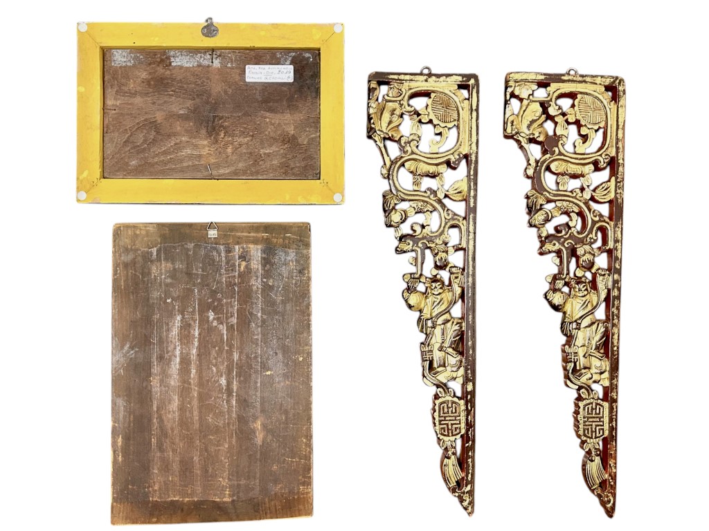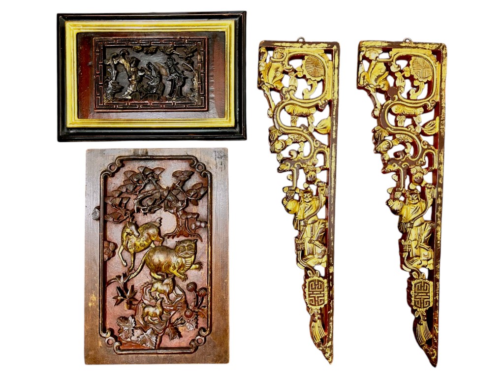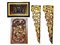 composto da due pannelli in legno intagliato e due fregi in legno laccato porpora e lumeggiati in oro