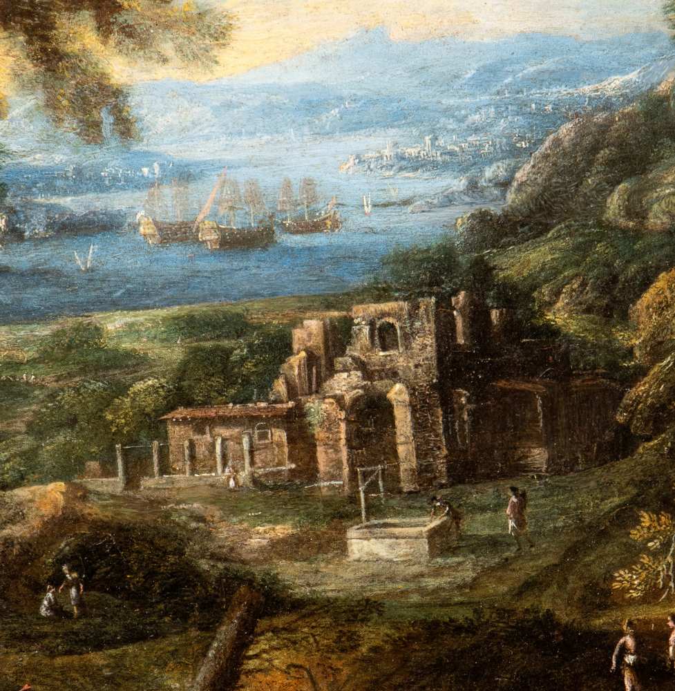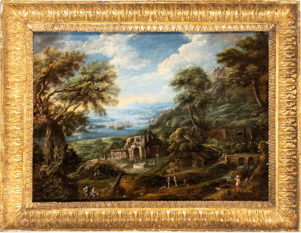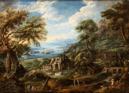 Artista fiammingo, XVII-XVIII secolo Paesaggio costiero con barche e figure...