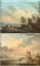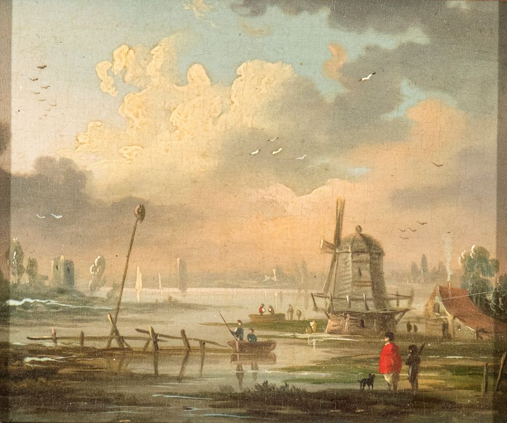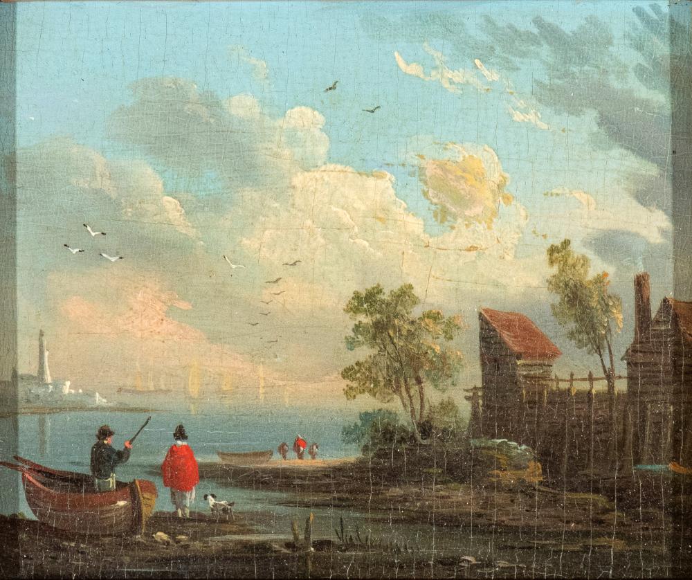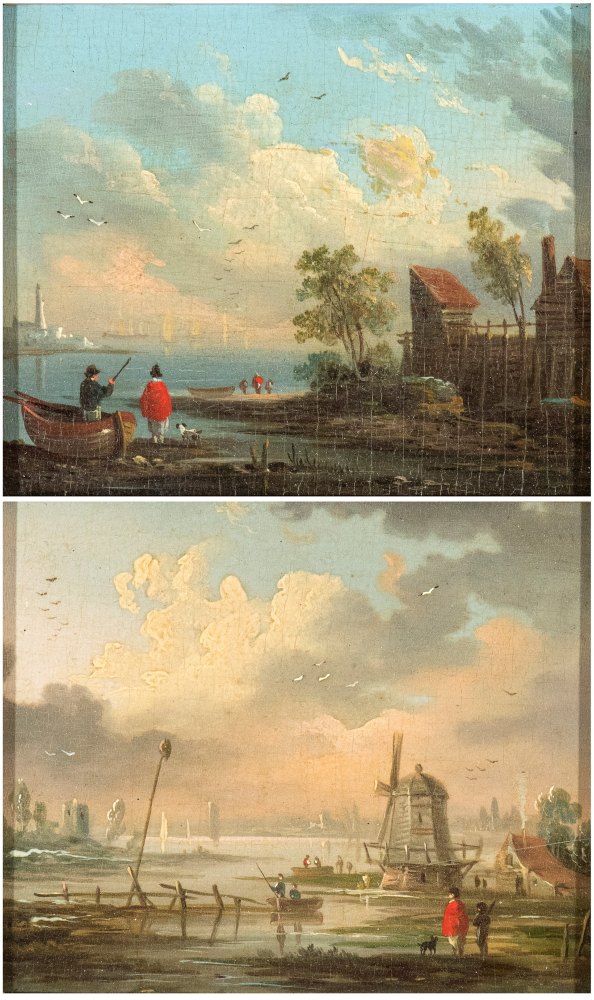 a) Paesaggio costiero con figure, casa e faro sullo sfondo; b) Paesaggio costiero con figure e mulino a vento. Coppia di dipinti