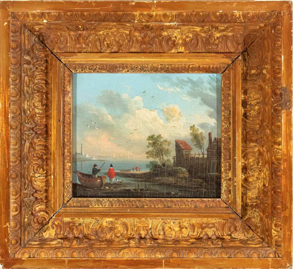 Artista fiammingo, XVIII secolo a) Paesaggio costiero con figure, casa e faro...