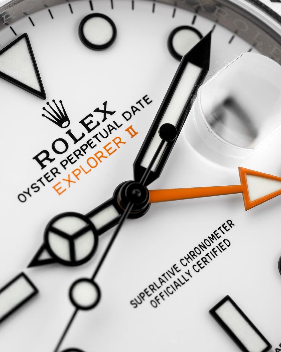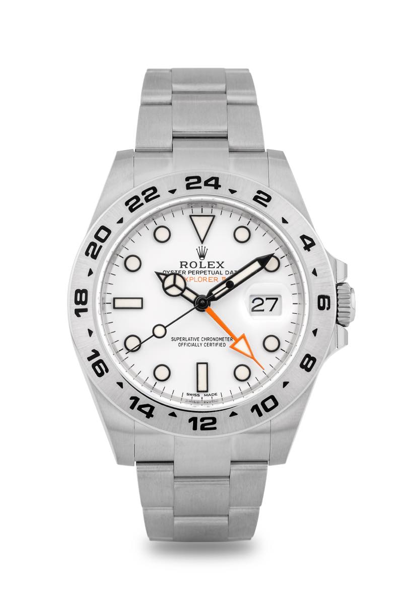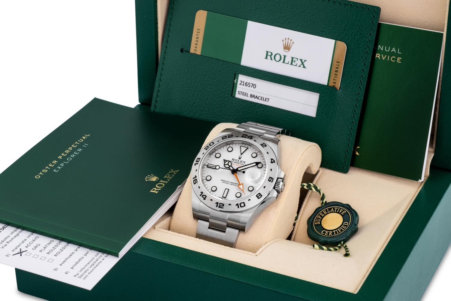 ROLEX Explorer II. Referenza 216570. Numero di serie alfanumerico. Movimento a carica automatica. Cassa in acciaio con diametro da 42 mm. Dial bianco con indici luminescenti e finestra per la data al 3. Ore, minuti, secondi e sfera GMT (arancione) al centro. Finestra per la data al 3. Bracciale Oyster in acciaio originale. Vetro zaffiro. Anno 2019. Orologio in ottime condizioni generali, pari al nuovo, probabilmente solo messo a misura, venduto con scatola e documenti originali. Perfettamente funzionante.