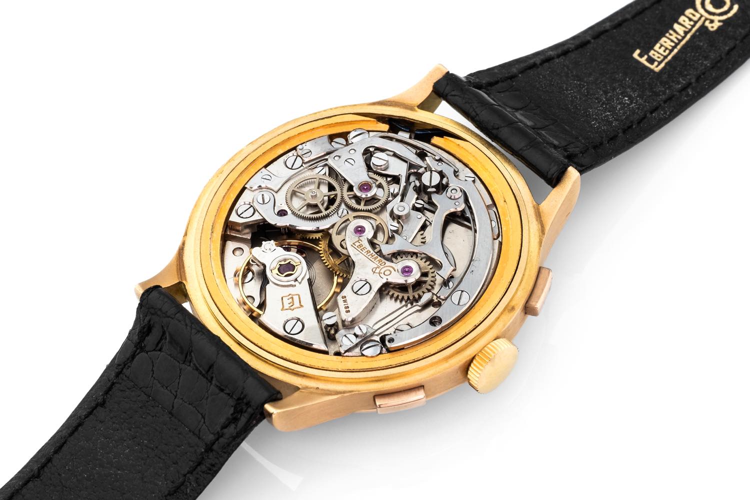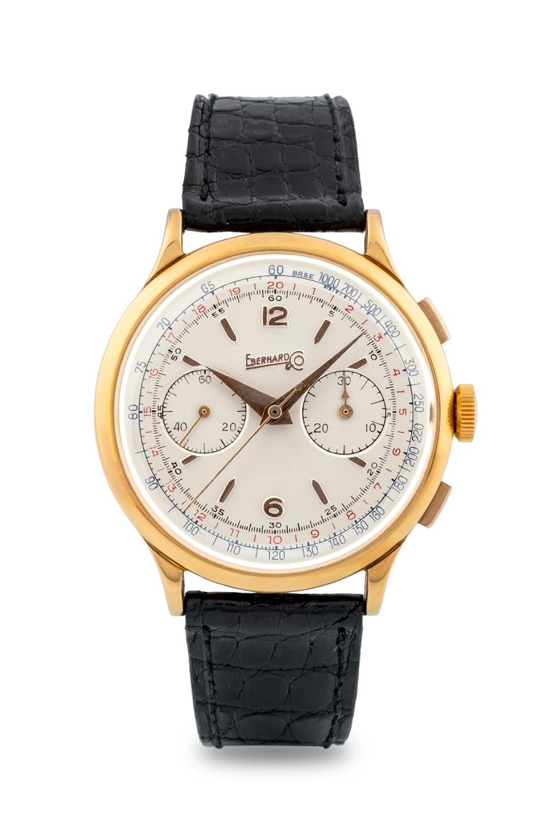 § EBERHARD & Co. Extra-Fort. Referenza 14007 64. Movimento a carica manuale. Cassa in oro 18kt con diametro da 38 mm. Dial bianco a grandi numeri arabi neri, doppio contatore con secondi al 9. Bracciale in pelle originale con fibbia ad ardiglione originale. Fondello in oro 18kt. Vetro plexiglas. 1940 ca. Orologio in buone condizioni generali, tasti per settaggio e regolazione del cronografo da revisionare (revisione fortemente consigliata). Al momento della catalogazione l’orologio risulta essere funzionante ma il movimento non è stato testato per la precisione del tempo.