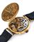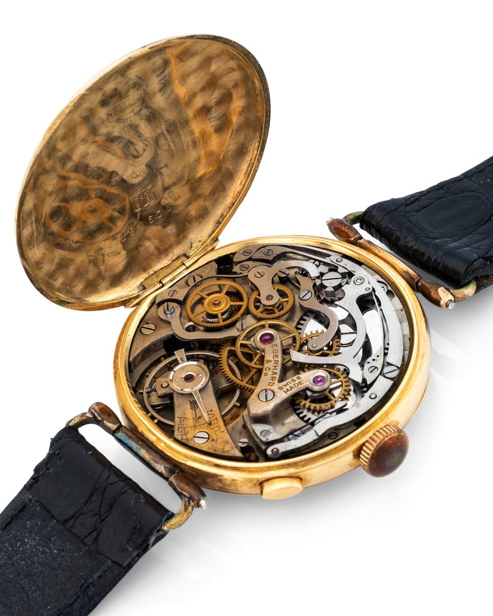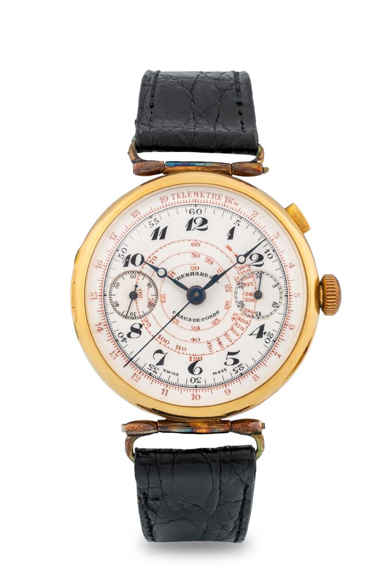 § EBERHARD & Co. Cronografo Monopulsante. Seriale 19XXXX. Movimento a carica manuale. Cassa in oro 18kt con diametro da 40 mm. Dial bianco in ceramica con grandi numeri arabi neri, funzione cronografo a 2 contatori, secondi al 9. Scala telemetrica stampata all'estremità. Anse snodabili. Bracciale in pelle non originale con fibbia ad ardiglione Eberhard laminata in oro. Fondello in oro 18kt con apertura a libro. Vetro plexiglas. 1940 ca. Orologio in discrete condizioni generali. Al momento della catalogazione l’orologio risulta essere funzionante ma il movimento non è stato testato per la precisione del tempo.