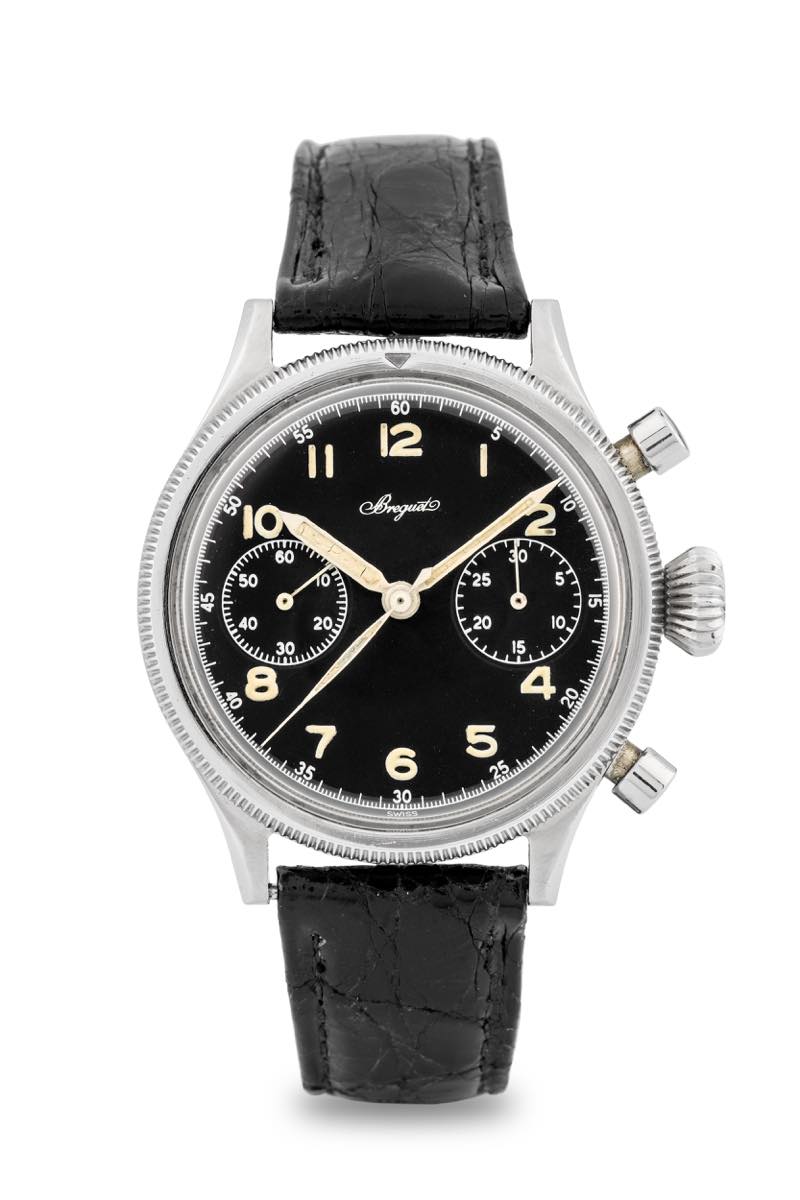 § BREGUET Type 20, 5101/54 "Armèe de l'Air” orologio militare. Seriale 8186. Movimento Ronda 222 a carica manuale. Cassa in acciaio con diametro da 39 mm. Dial nero con grandi numeri arabi al trizio. Funzione cronografo a 2 contatori con secondi al 9. Tasti per settaggio e azionamento del cronografo a pompa. Lunetta girevole bidirezionale. Bracciale in pelle con fibbia ad ardiglione anonima in acciaio. Fondello in acciaio a vite. Vetro plexiglas. 1950 ca. Orologio in discrete condizioni generali. Al momento della catalogazione l’orologio risulta essere funzionante ma il movimento non è stato testato per la precisione del tempo.