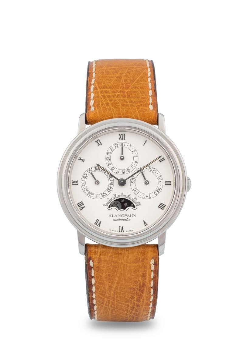 § BLANCPAIN Villeret Perpeual Calendar. Seriale 7X. Movimento con calibro 95 a carica automatica. Cassa in acciaio con diametro da 35 mm. Dial bianco con triplo calendario e fasi lunari al 6. Ore e minuti al centro. Bracciale in pelle originale con fibbia ad ardiglione in acciaio originale. Fondello a scatto. Vetro minerale. 1990 ca. Orologio in ottime condizioni generali, funzionante. Al momento della catalogazione l’orologio risulta essere funzionante ma il movimento non è stato testato per la precisione del tempo.