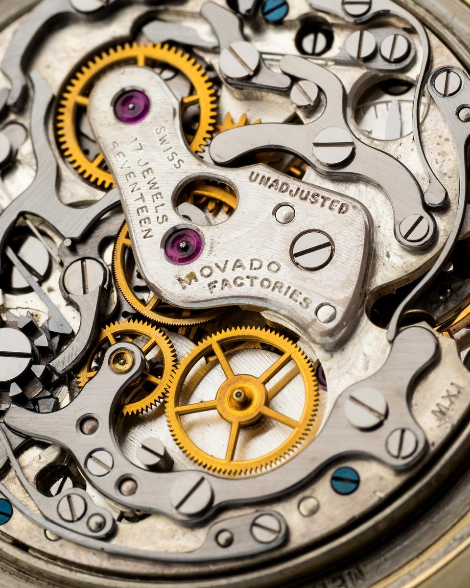 § MOVADO Cronografo. Referenza 49038. Seriale A10XXX. Movimento a carica manuale. Cassa in oro 14kt con diametro da 35 mm. Dial panna con scritta “Tiffany & Co.”, secondi al 9. Tasti per settaggio e azionamento del cronografo a pompa. Bracciale in pelle non originale con fibbia ad ardiglione anonima. Fondello in oro 14kt. Vetro plexiglas. 1950 ca. Orologio in buone condizioni generali. Pur lasciando la valutazione finale al cliente, a nostro giudizio la scritta “Tiffany & Co” è una ristampa eseguita successivamente e non ha nulla a che vedere con il famoso brand, è molto probabile che l’orologio sia uscito con il classico quadrante con scritta “MOVADO”. Al momento della catalogazione l’orologio risulta essere funzionante ma il movimento non è stato testato per la precisione del tempo.