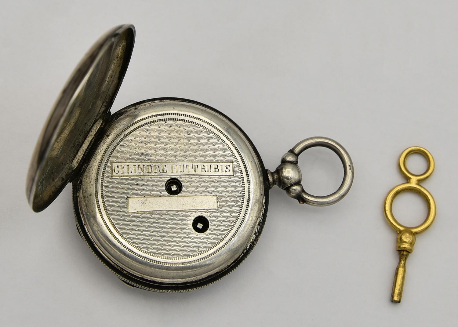 CASSA: in argento con doppio fondello, lavorata sul retro a sbalzo e incisione; numero di cassa e punzone dell'argento (granchio) visibili sulla superficie interna di entrambi i fondelli; sulla superficie esterna del fondello piu' interno inciso: "CYLINDRE HUIT RUBIS"
