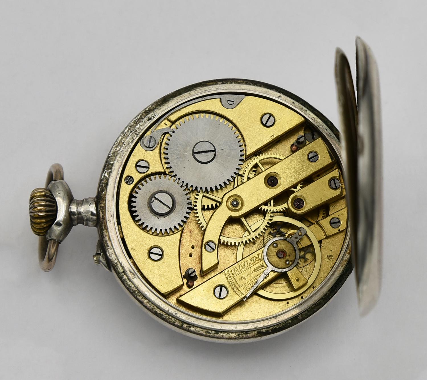CASSA: in argento con doppio fondello, lavorata sul retro a sbalzo e incisione; numero di cassa, titolo e punzone (gallo) dell'argento visibili sulla superficie interna di entrambi i fondelli; sulla superficie esterna del fondello piu'interno inciso: "Remontoir/Cylindre 10 Rubis"