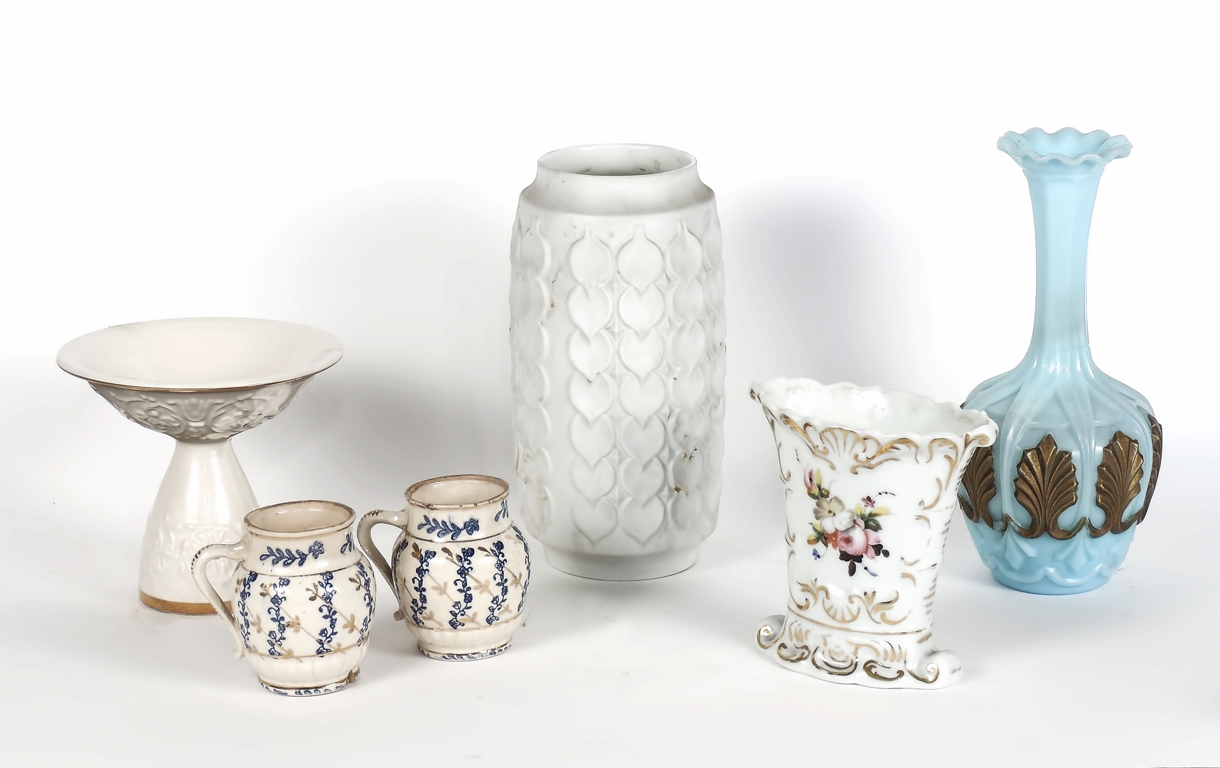 LOTTO DI CERAMICHE tra cui un vaso in biscuit ed un altro in vetro lattimo