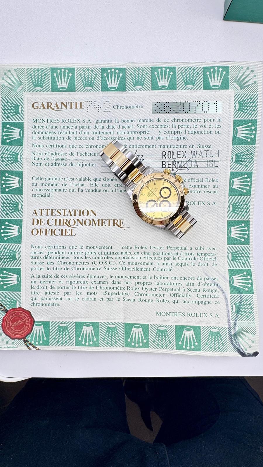 Marca Rolex Modello (Orologio) Daytona Numero di referenza 16523 Carica Automatico Materiale della cassa Oro/Acciaio Materiale cinturino Oro/acciaio Anno di produzione 1994 Corredo documenti originali, no box Carica Automatico Cassa Materiale della cassa Oro/Acciaio Diametro 40 mm Impermeabile 10 ATM Materiale lunetta Oro giallo Vetro Vetro zaffiro Cinturino Materiale cinturino Oro/acciaio Colore cinturino Oro/acciaio Chiusura Déployante Materiale chiusura Oro/Acciaio Funzioni Cronografo