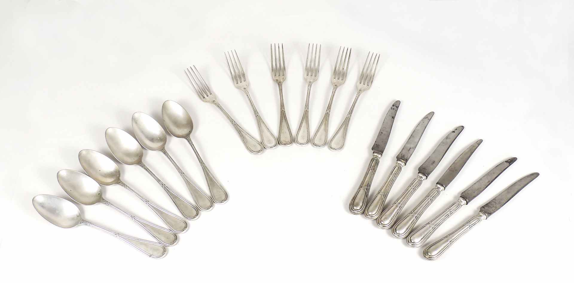 SERVITO DI POSATINE DA DOLCE IN ARGENTO Francia, fine del XIX secolo completo per sei persone, manici sbalzati con motivo di nastri intrecciati gr complessivi esclusi i coltelli 580 (18)