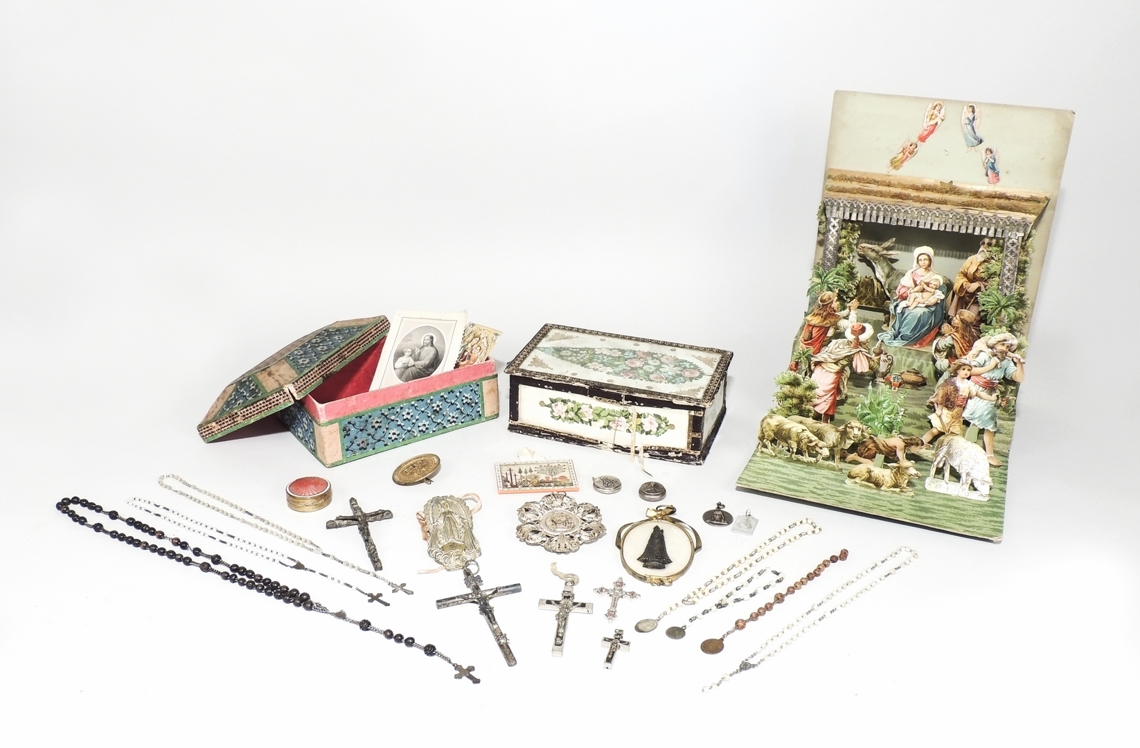 LOTTO DI CURIOSITÀ D'EPOCA contenute in due scatoline rivestite in carta decorata e dipinta, composto da un medaglione ovale in argento con cornicetta in filigrana contenete immagine sacra, altre immagini devozionali, santini, alcuni rosari ed un presepe pop-up in cartoncino