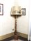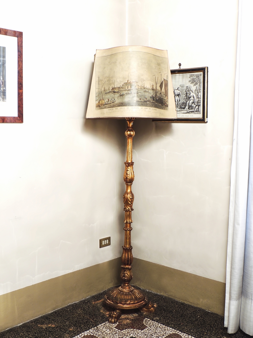 PIANTANA IN LEGNO INTAGLIATO E DORATO prima metà del XX secolo su tre piedi a zampa ferina, con paralume in carta decorata con vedute veneziane h cm 151