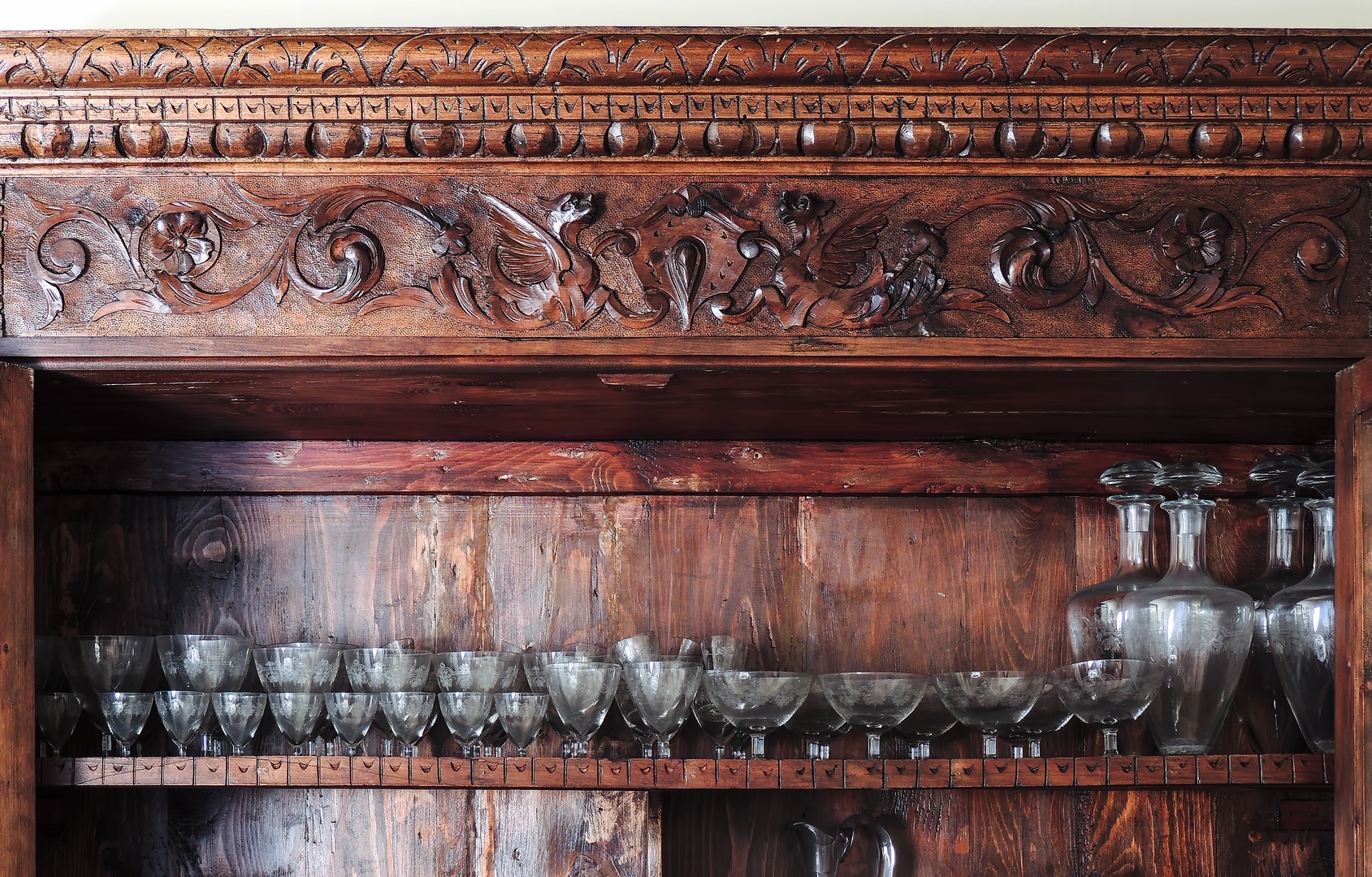 SERVITO DI BICCHIERI IN CRISTALLO PIROGRAFATO composto da 11 bicchieri da acqua, 12 da vino, 6 da vino bianco, 11 da liquore, 5 da vin santo, 10 coppe da champagne e quattro bottiglie (54)