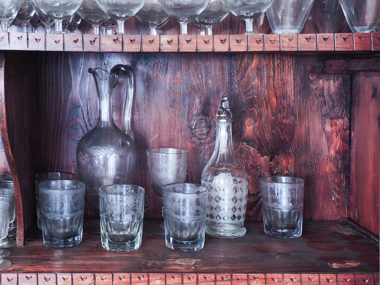 SEI BICCHIERI IN CRISTALLO MOLATO XIX secolo alcuni con nomi della famiglia Pandolfi, con bottiglia en pendat ed un'altra simile (8)