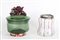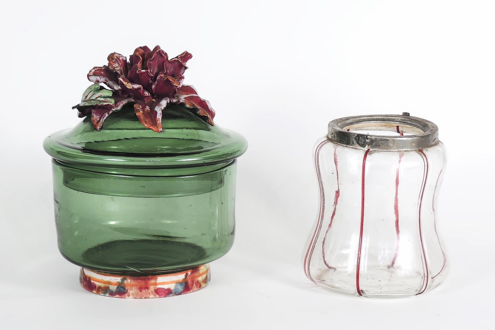 DUE BISCOTTIERE XIX secolo una in vetro soffiato verde, coperchio sormontato da fiore in pasta di vetro screziata nei toni del rosa ed un'altra rilegata in metallo, difetti